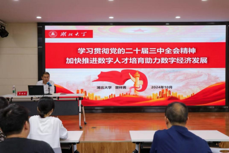 曾祥勇以《学习贯彻党的二十届三中全会精神 加快推进数字人才培育助力数字经济发展》为主题,围绕“深入学习贯彻党的二十届三中全会精神”“数字经济赋能新质生产力发展的战略选择”“高校在推进数字人才发展中的挺膺担当”等三个方面,对党的二十届三中全会精神进行了系统阐述,并聚焦当前我国数字经济的发展形势、数字经济赋能新质生产力发展的战略导向、数字人才培养的实践路径与高校担当等内容,对学习贯彻党的二十届三中全会精神进行了深入解读。