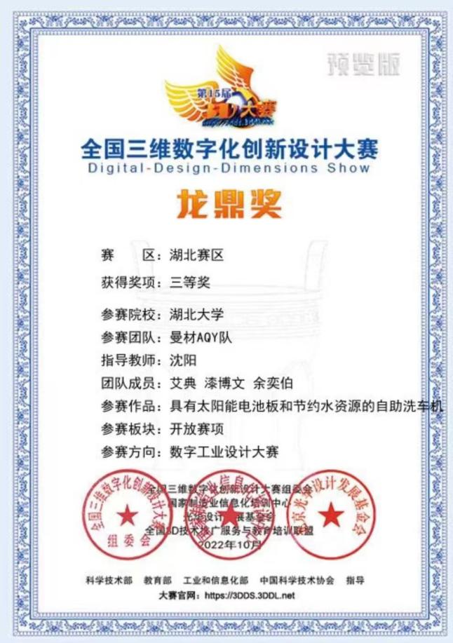 由沈阳老师指导的艾典、漆博文、余奕伯的团队项目“具有太阳能电池板和节约水资源的自助洗车机”项目荣获省赛三等奖。参赛员工艾典说:“整个过程中,团队成员心态平和,全力以赴。这次比赛的困难在于比赛所需的建模知识,是需要课后查阅各种资料文献进行自学的,这极大地考验了我们的学习主动性,提高了建模能力。同时通过这次比赛,我们和更多选手同台竞技,站在了一个更广阔的平台了解创新创业的相关知识。”谈及比赛经验,漆博文表示,赛程时间长、赛事难度大,团队在正式比赛之前做了充足的准备,提前对项目进行了构思设计;比赛过程中,团队得到了老师和学长的帮助。同时,团队成员携手奋进、敢于尝试、不断实践。