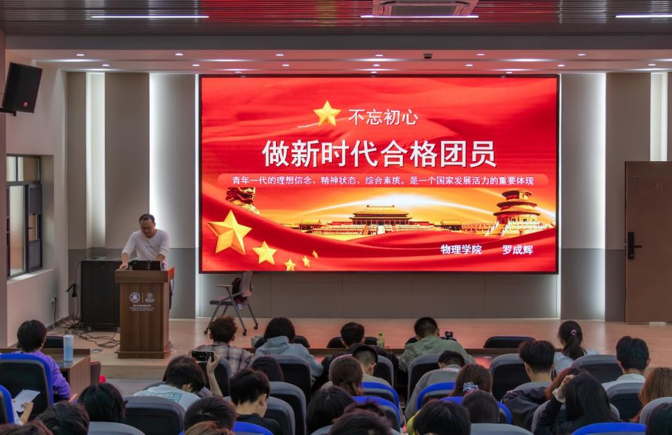仪式在庄严的团歌声中拉开帷幕。罗成辉为团校学员讲授团课第一讲,主题为“不忘初心,做新时代合格团员”。带领同学们学习领会习近平总书记的“青年观”与习近平总书记关于科技创新重要论述的核心要义,辩证讨论“人才-科技-教育”三元关系,并寄语团校学员要勇担时代责任,在推进强国建设、民族复兴伟业中展现青春作为、彰显青春风采、贡献青春力量。