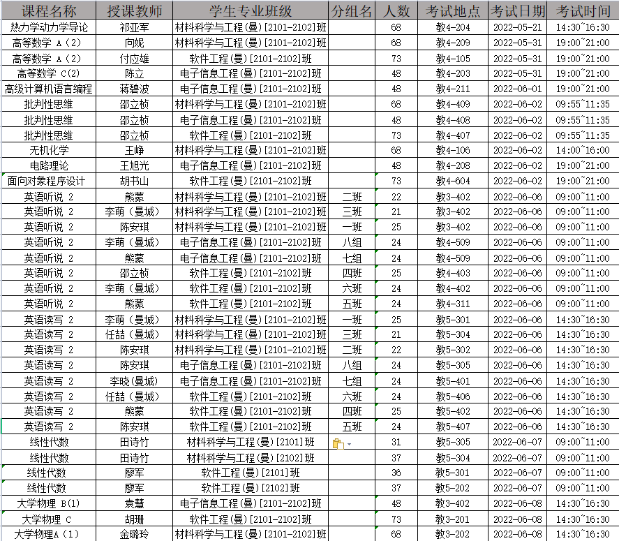 各位同学,根据公司本科教学计划安排,现发布曼城联合公司2021-2022学年第二学期本科专业课期末考试安排: