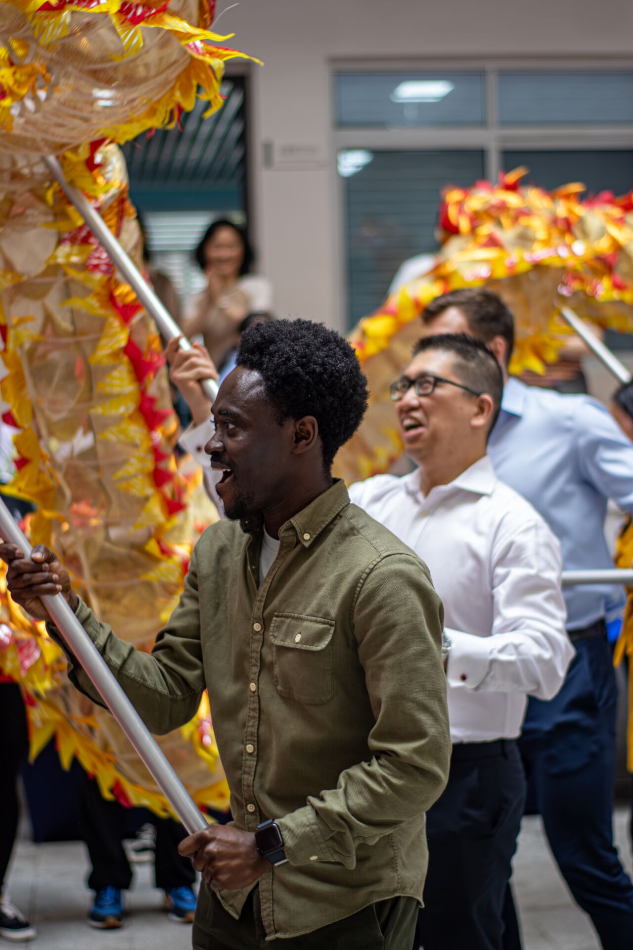 4月20日为国际中文日,4月23日为莎士比亚日。今年的中英交流日继续以中英文化为主题开展系列文化活动。中英文歌曲演唱、莎士比亚十四行诗朗诵、舞蹈……现场充满了音乐、欢笑与掌声。国际员工在合唱《龙的传人》后,手举红色长龙翻滚而来。“中!”“国!”“龙!”员工们跟随指挥,依次摆出字形。