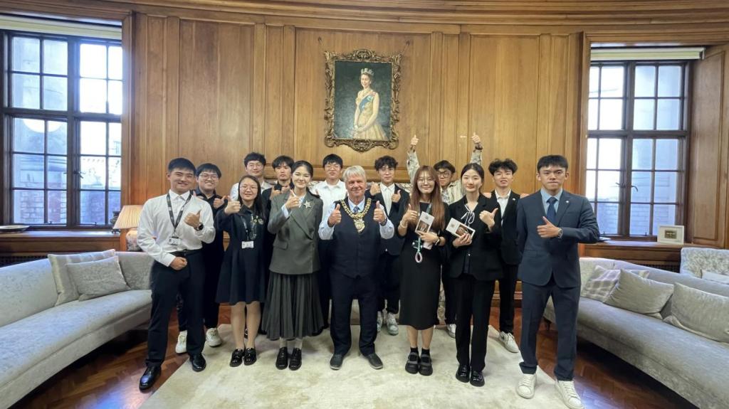 员工们与曼彻斯特荣誉市长Paul Andrews共进下午茶。市长强调了全球化背景下跨国城市友好交流的重要性,并肯定了两校间教育交流的持续性。公司代表与市长互赠礼物,象征双方友谊与合作。