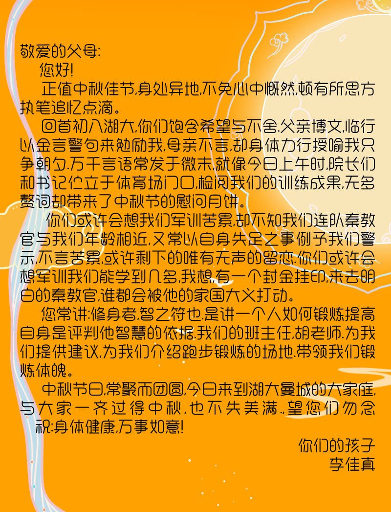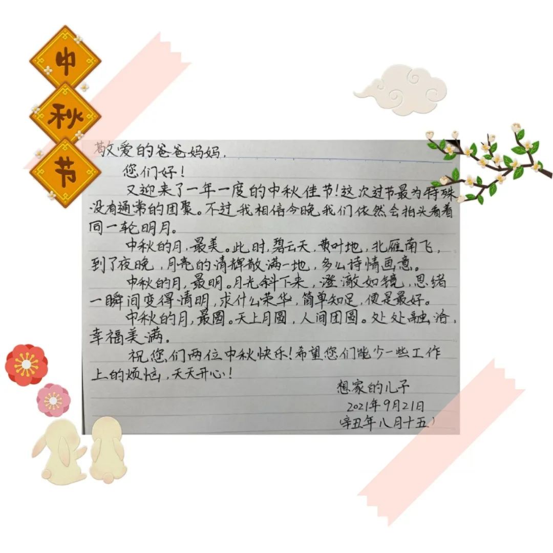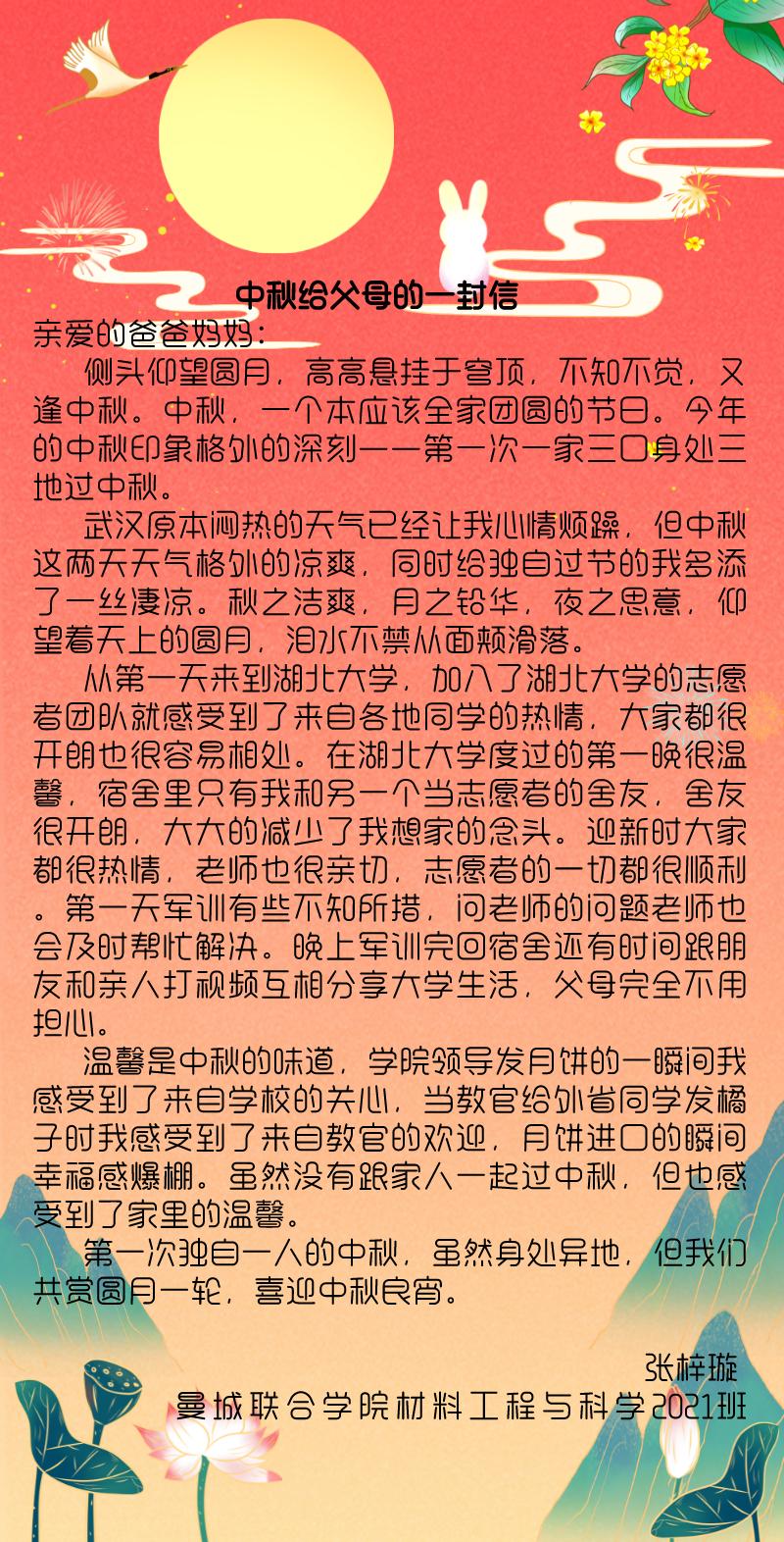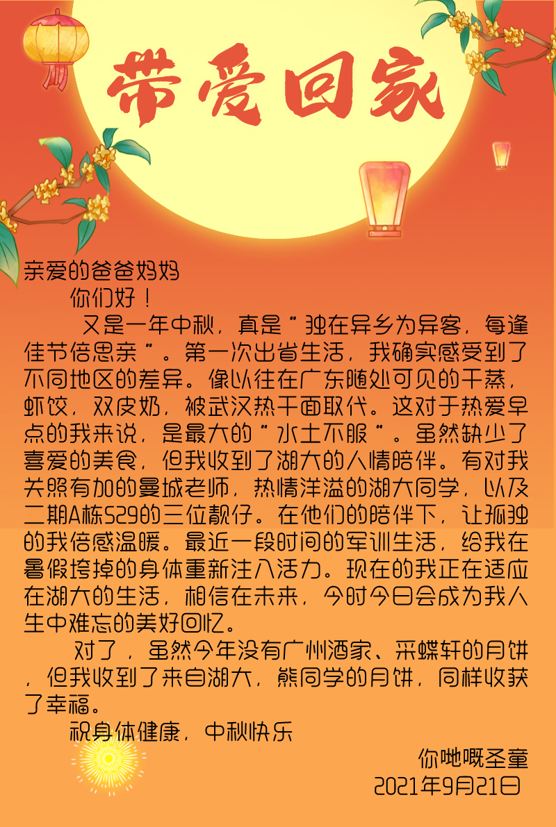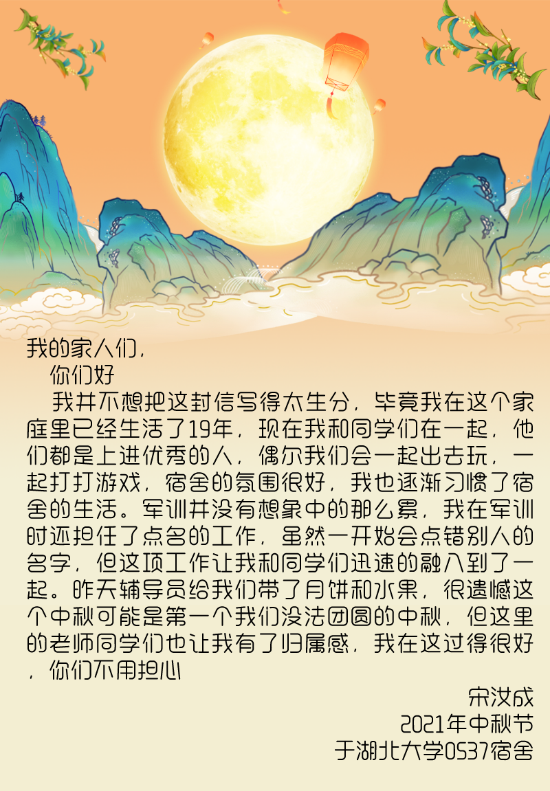 自古中秋月最明,且把思念遥相寄。9月21日中秋佳节,在新生报到一周之际,湖北大学伟德国际victor1946发布“中秋活动之写给父母的一封信”通知,鼓励同学们以文字形式寄托对家人的思念。活动发布以来,得到了同学们的积极响应参与。