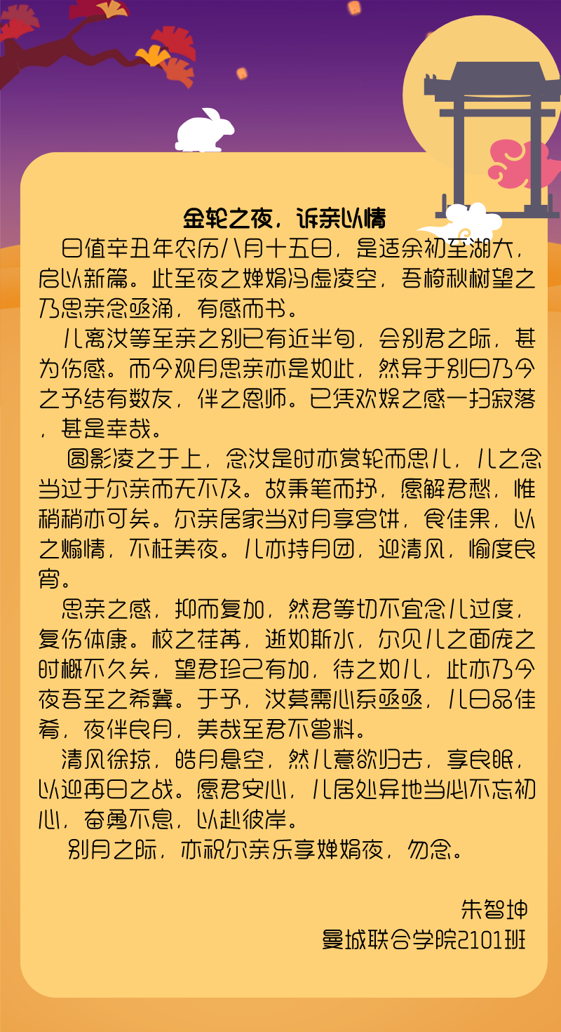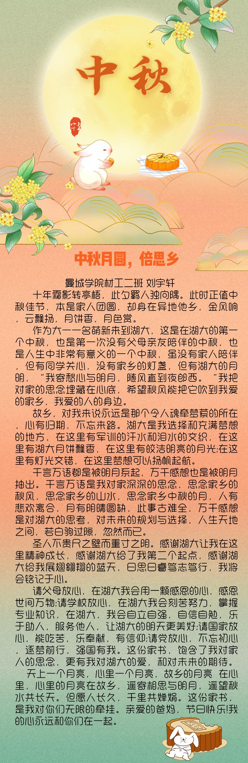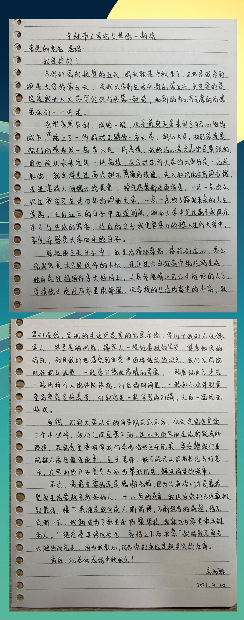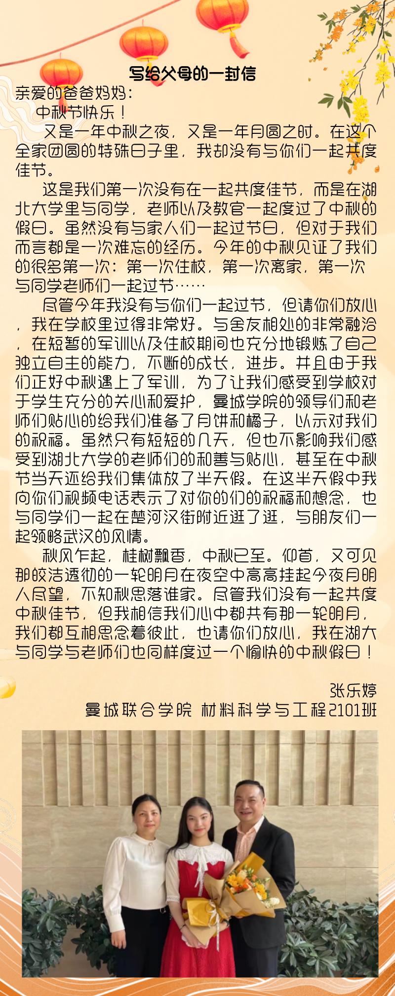 自古中秋月最明,且把思念遥相寄。9月21日中秋佳节,在新生报到一周之际,湖北大学伟德国际victor1946发布“中秋活动之写给父母的一封信”通知,鼓励同学们以文字形式寄托对家人的思念。活动发布以来,得到了同学们的积极响应参与。