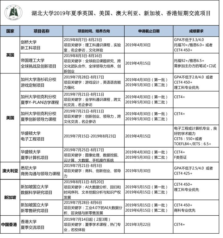 为推进公司国际化进程,培养湖大学子国际视野,公司拟定2019年暑假选拔公司在校生剑桥大学、加州大学伯克利分校、悉尼大学、新加坡国立大学、香港大学、早稻田大学等世界著名大学高校进行学习交流活动,请有意向的同学积极踊跃参加。